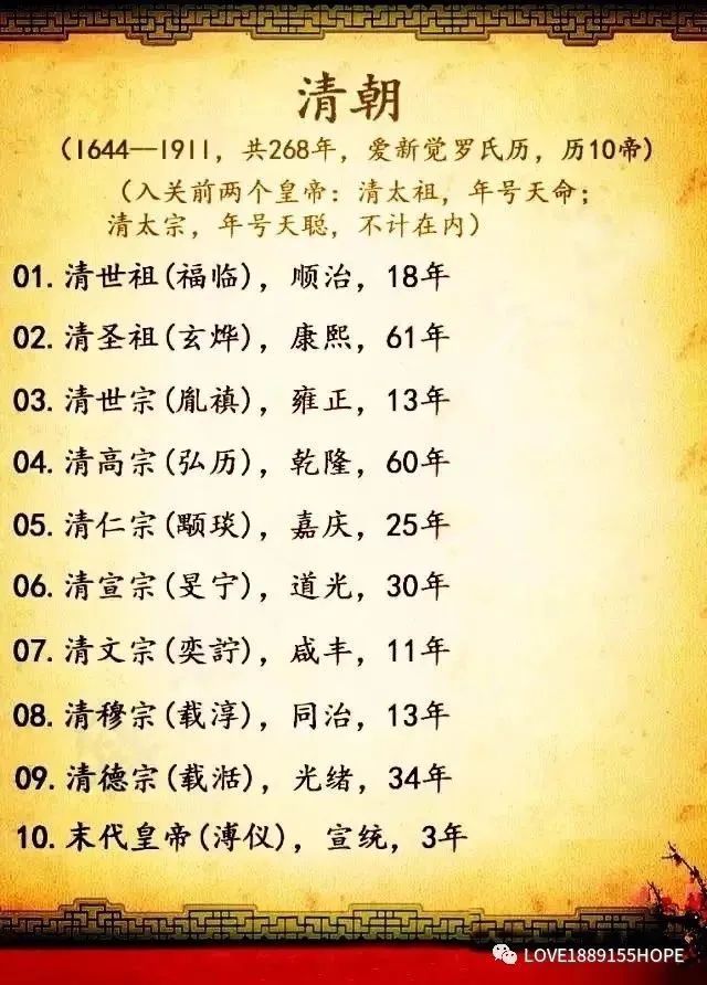 清朝:公元1636-1912年,清太祖爱新觉罗·努尔哈赤,共计:267年。