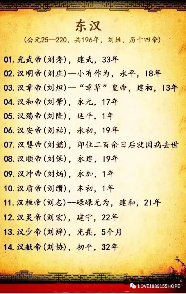 东汉:公元25-220年,汉光武帝刘秀,共计:196年。