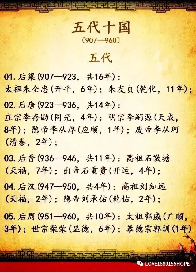 五代:公元907-960年,后梁、后唐、后晋、后汉、后周,共计:54年。