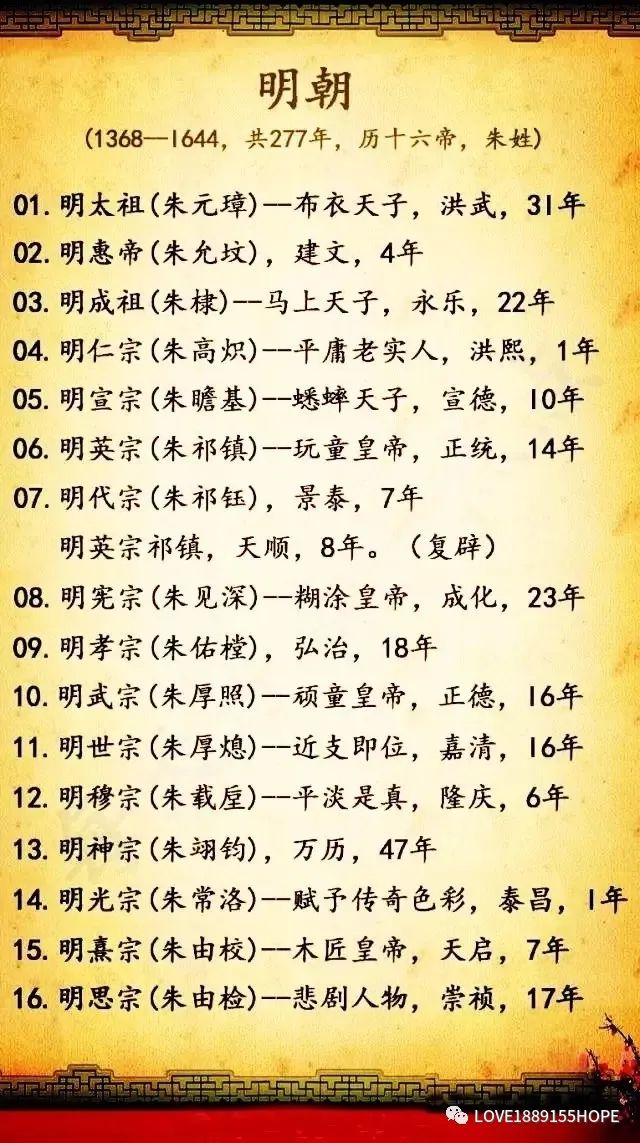 明朝:公元1368-1644年,明太祖朱元璋,共计:277年。