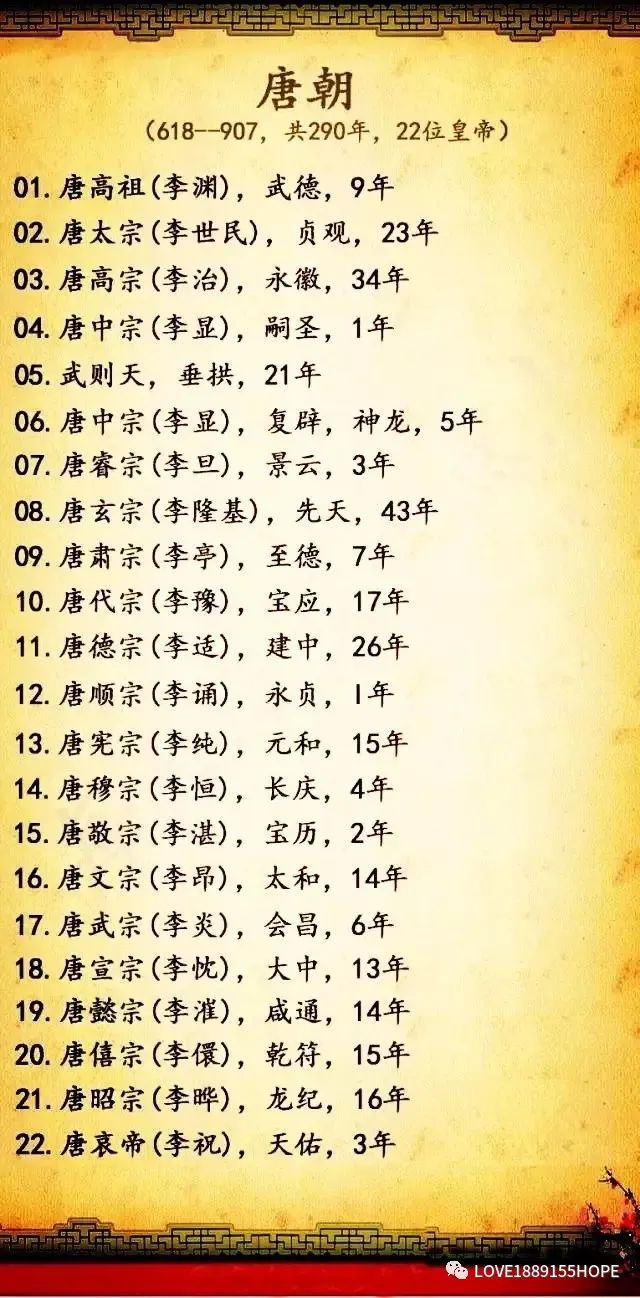 唐朝:公元618-907年,唐高祖李渊,共计:290年。