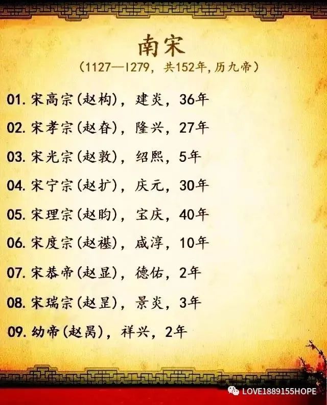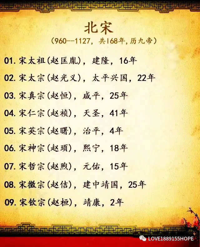 宋朝:公元960-1279年,分为北宋(公元960-1127年)、南宋(公元1127-1279年),共计:320年。
