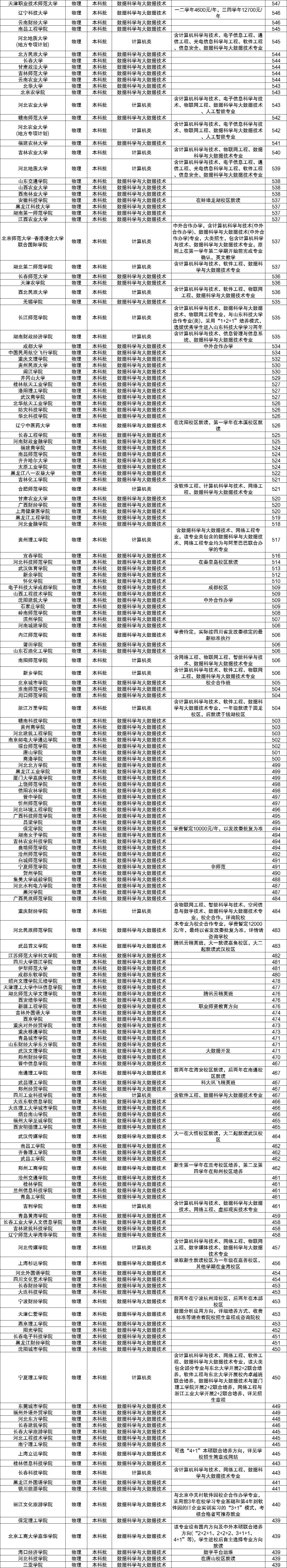 下表为2023年全国大学数据科学与大数据技术专业在河北物理科目的最低分数排名。