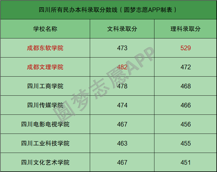 (2)民办:文科录取分数最高的是成都文理学院,为482分;理科录取分数最高的成都东软学院,为529分。以下为民办院校具体录取情况: