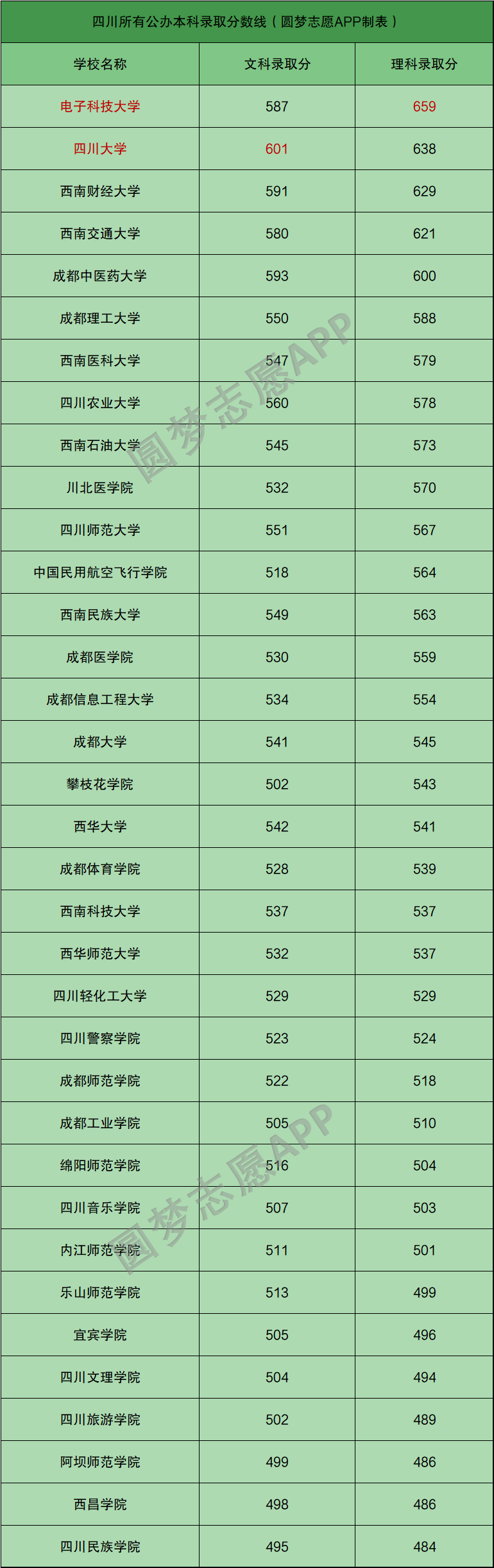 (1)公办:文科录取分数最高的是四川大学,为601分;理科录取分数最高的是电子科技大学,为659分;其中四川大学为综合性院校,电子科技大学为理工类院校,两所院校都非常适合成绩优秀的学生报考。以下为公办院校具体录取情况:
