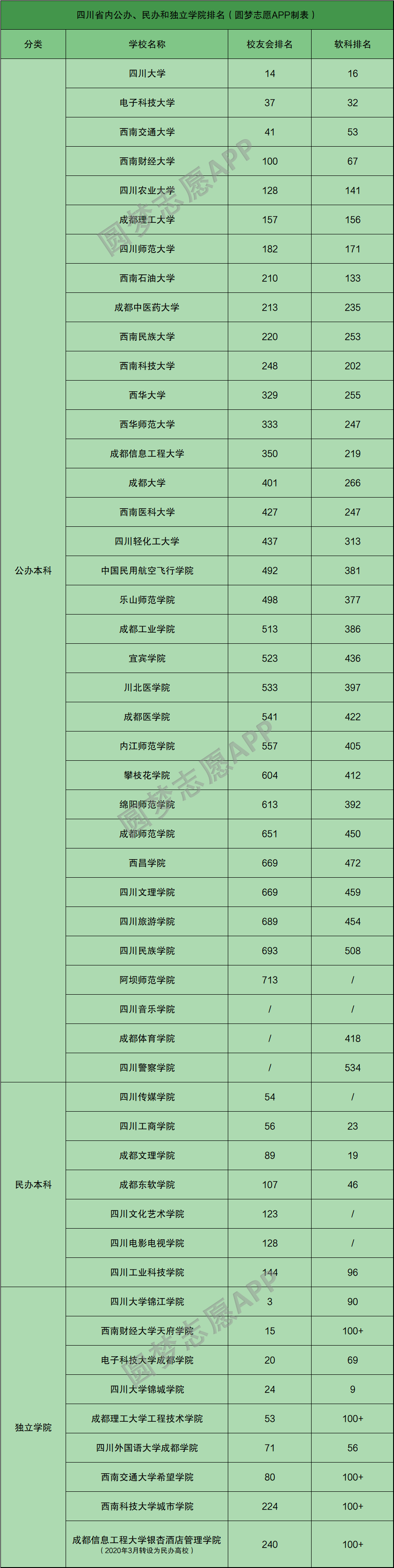 (3)独立学院:四川大学锦江学院、四川大学锦城学院、电子科技大学成都学院在两个榜单中的排名都非常靠前,属于省内乃至全国相对较好的独立学院。以下为具体排名情况:
