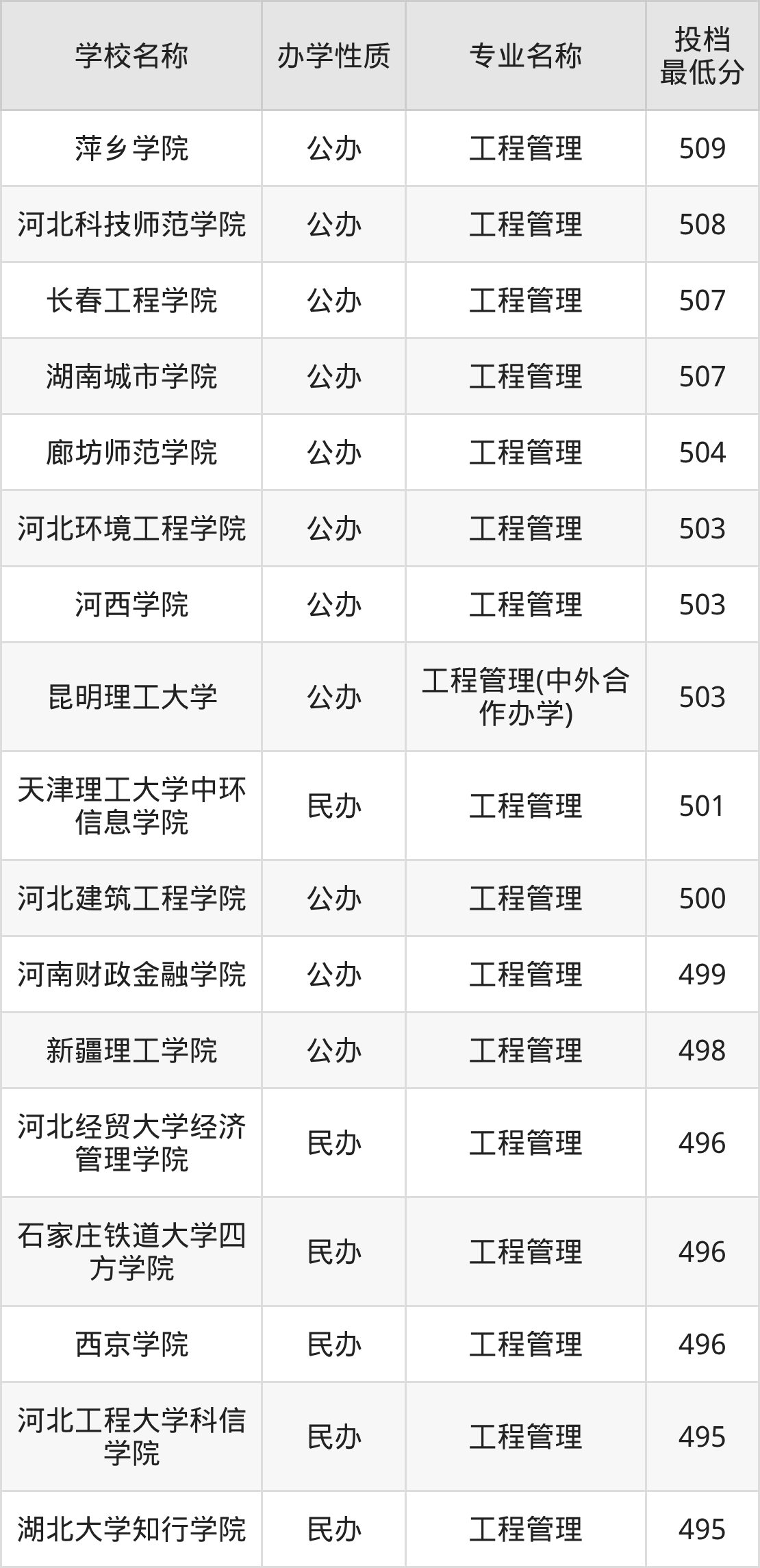 500分左右的工程管理大学:天津理工大学中环信息学院501分、昆明理工大学503分(中外合作办学)、河西学院503分、河北环境工程学院503分、廊坊师范学院504分等;