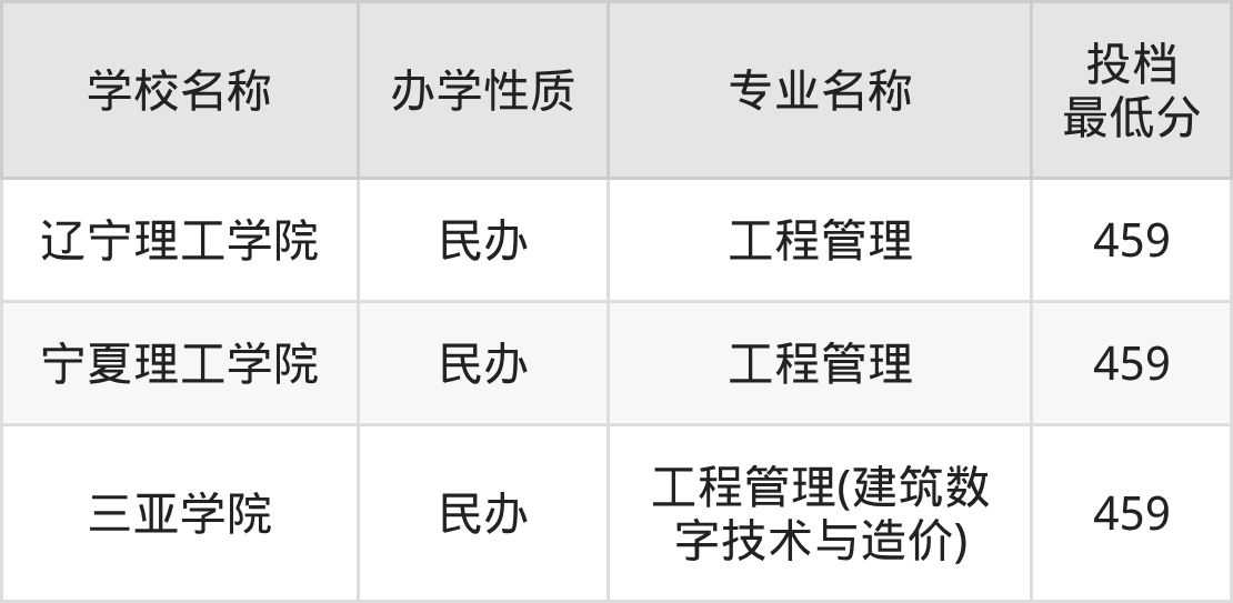 2025年工程管理专业最低录取分数线是459分,刚好在本科分数线(459分)处。也就是说想报考工程管理专业的同学,至少得达到本科线459分及以上。工程管理专业最低分的大学是三亚学院,不过该校属于民办。