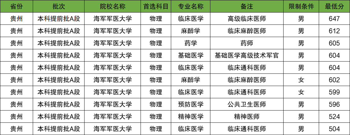2025年海军军医大学生长军官本科学员在贵州的录取分数线整理如下,供大家参考。