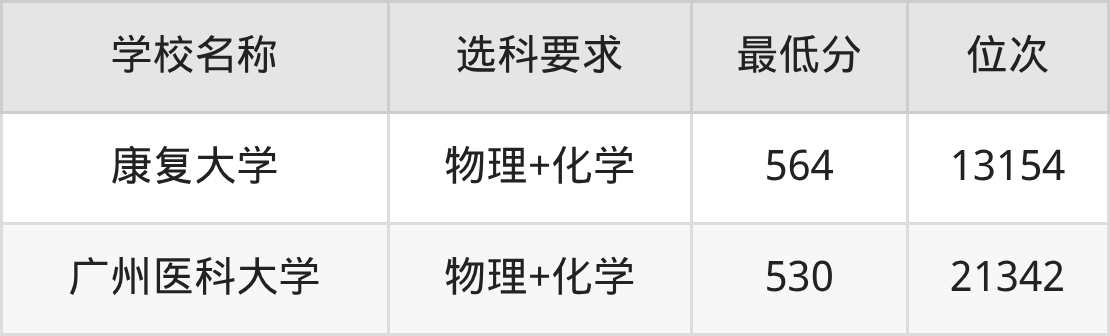 在内蒙古招生的院校中,有2所要求考生必选“物理+化学”,如康复大学、广州医科大学。