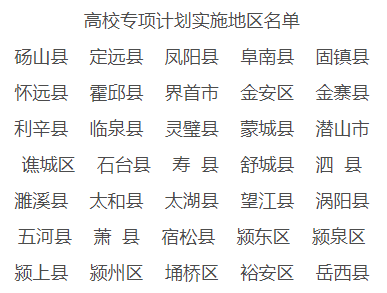 因为高校专项计划只在规定的实施区域内招生,只有实施区域的农村考生才能报考,本文也整理出安徽高校专项计划实施区域,供参考。