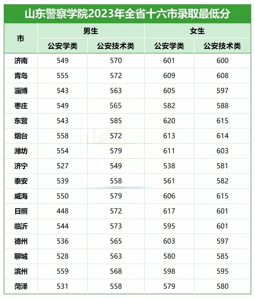 2023年山东考生想要报考省属警校——山东警察学院,男生最低需要448分(日照市公安学类专业)、女生最低需要538分(济宁市公安学类专业)。