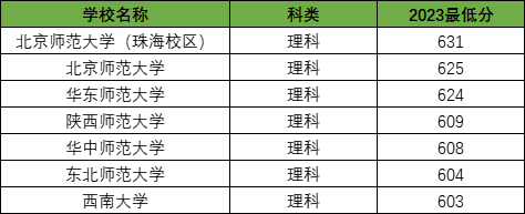 在理科公费师范生中录取分数最高的大学为北京师范大学(珠海校区),2023年最低分为659分;录取分数最低的公费师范院校为陕西师范大学,2023年最低分为618分。