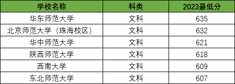 2023年六所免费师范大学国家公费师范生在河南文科的最低录取分数线在607分-635分之间,录取分数最高的是华东师范大学,2023年最低分为635分;录取分数最低的是东北师范大学,2023年最低分为607分。