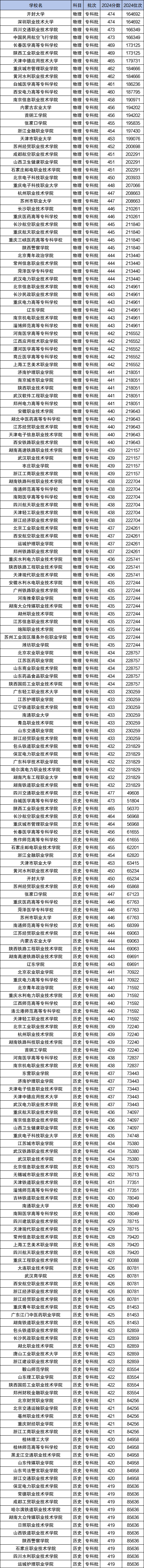 以下是2024年全国专科大学在河北省物理类/历史类录取分数线排名前100的大学名单及分数线: