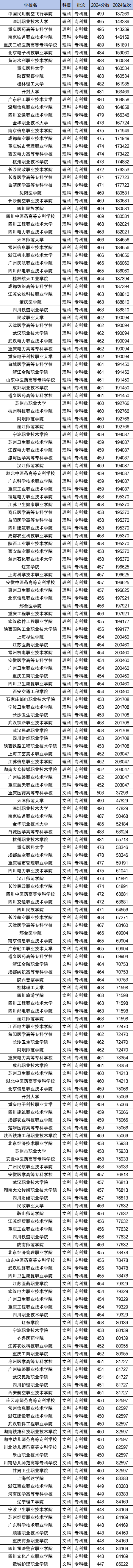 以下是2024年全国专科大学在四川理科/文科录取分数线排名前100的大学名单及分数线: