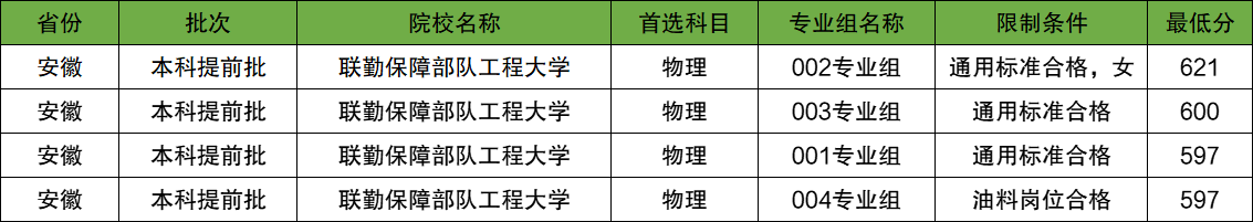 2025年联勤保障部队工程大学生长军官本科学员在安徽的录取分数线整理如下,供大家参考。