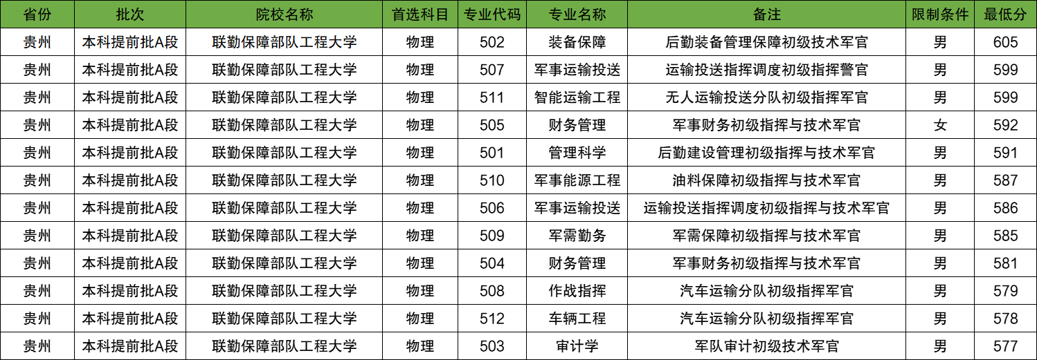 2025年联勤保障部队工程大学生长军官本科学员在贵州的录取分数线整理如下,供大家参考。