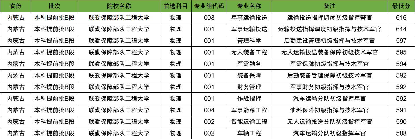 2025年联勤保障部队工程大学生长军官本科学员在内蒙古的录取分数线整理如下,供大家参考。