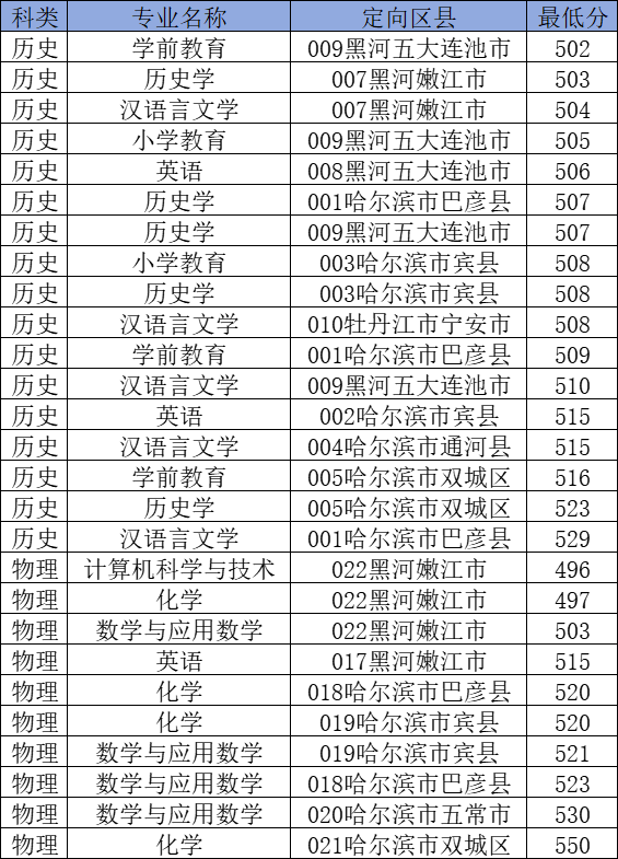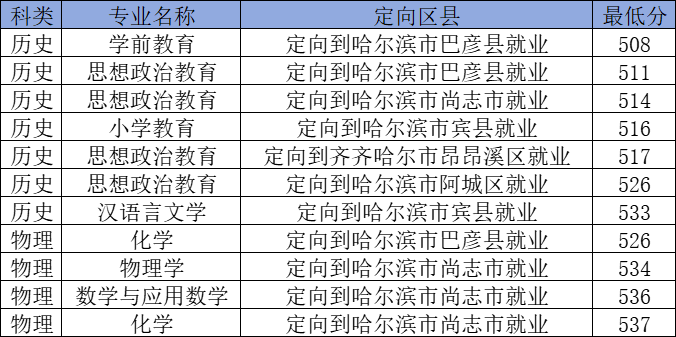 2024年定向师范生最低录取分数线为:历史类508分,专业是学前教育,定向地区为哈尔滨市巴彦县;物理类526分,专业是化学,定向地区为哈尔滨市巴彦县。面向不同地区就业最低分一览表: