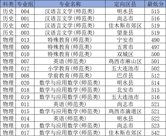2024年定向师范生最低录取分数线为:历史类515分,专业是汉语言文学(师范类),定向地区为明水县;物理类490分,专业是特殊教育(师范类),定向地区为宁安市。面向不同地区就业最低分一览表:
