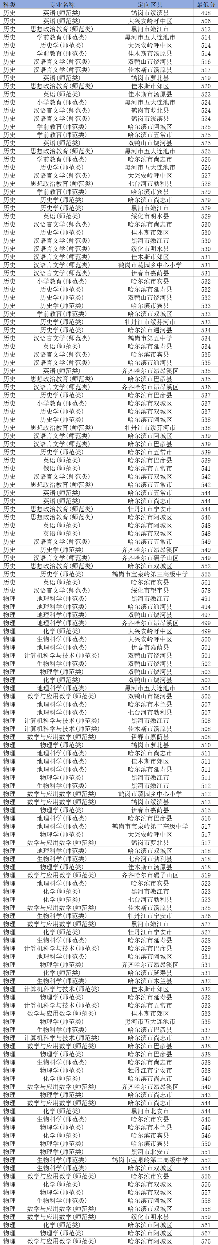 2024年定向师范生最低录取分数线为:历史类498分,专业是英语(师范类),定向地区为鹤岗市绥滨县;物理类491分,专业是地理科学(师范类),定向地区为黑河市嫩江市。面向不同地区就业最低分一览表: