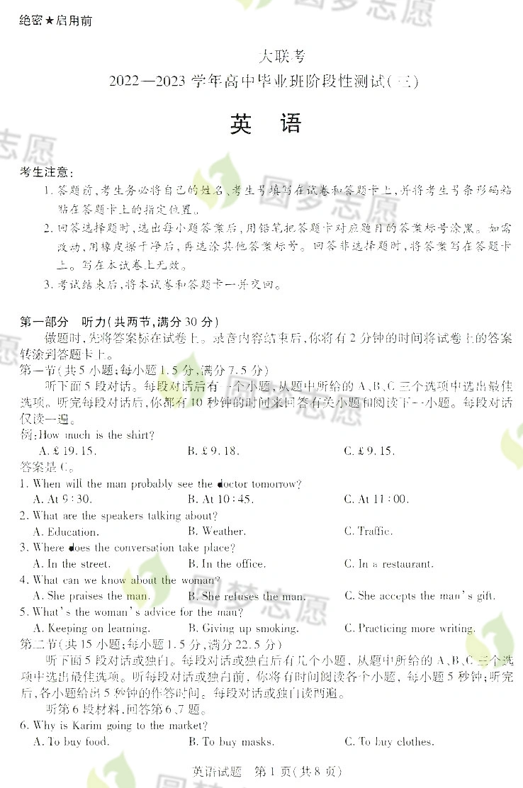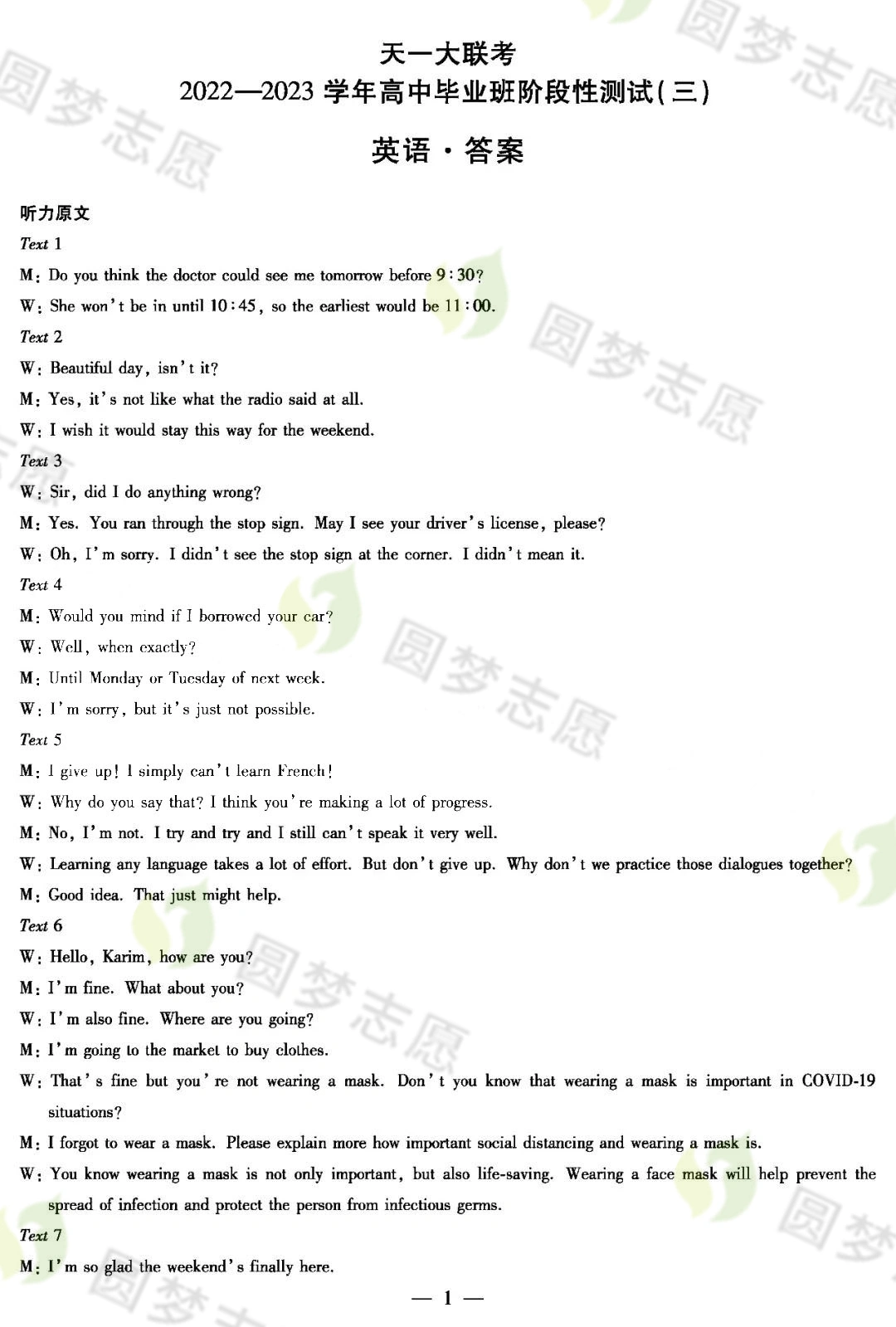 2023天一大联考高三12月三联考试将于2022年12月6日开考,考试结束后高考100网小编将更新2023天一大联考高三12月三联考试英语答案及试卷,下文为高考100网小编搜集整理的2023天一大联考高三12月三联考试英语试题及参考答案,供大家参考。
