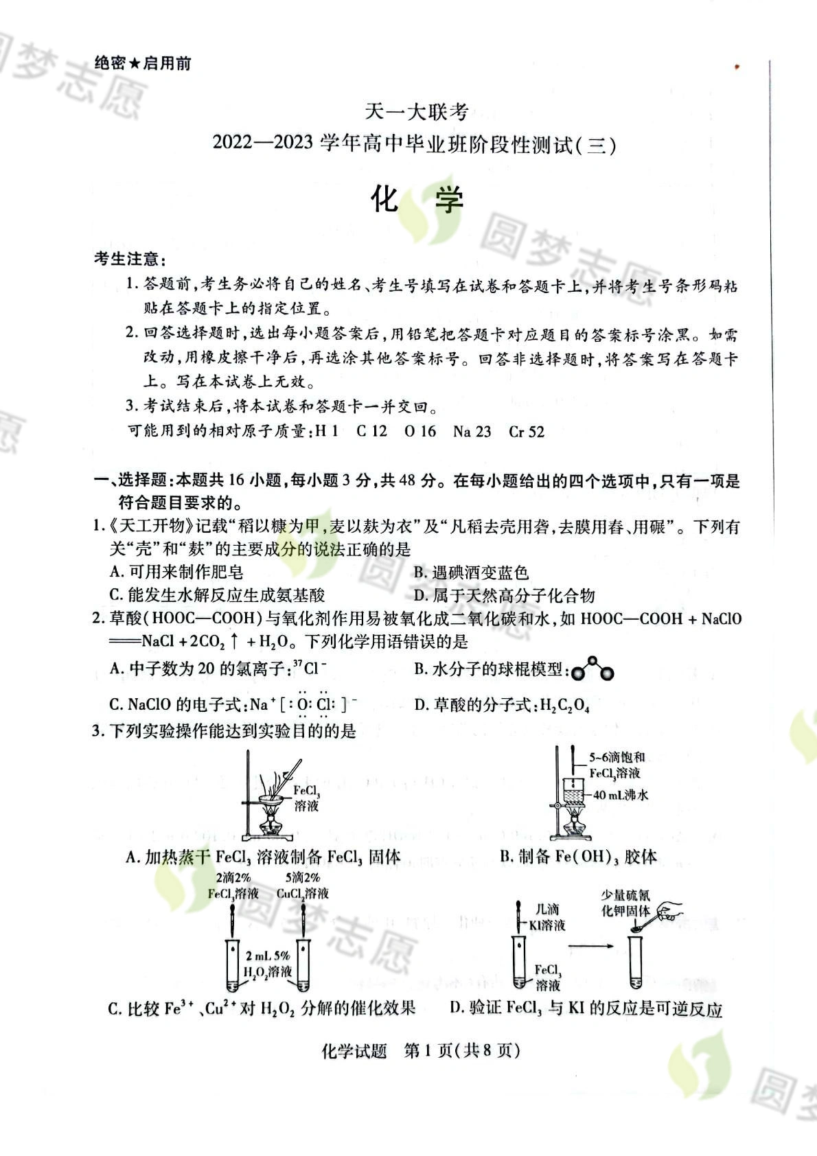 2023天一大联考高三12月三联考试将于2022年12月6日开考,考试结束后高考100网小编将更新2023天一大联考高三12月三联考试化学答案及试卷,下文为小编搜集整理的2023天一大联考高三12月三联考试化学试题及参考答案,供大家参考。
