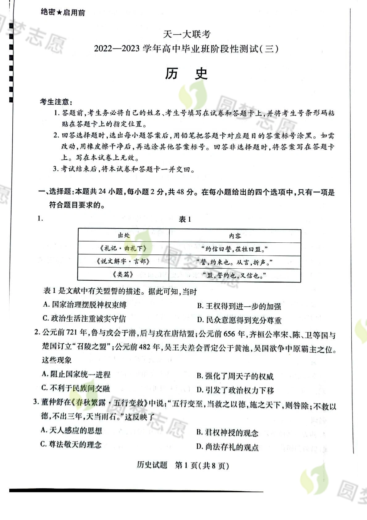 2023天一大联考高三12月三联考试将于2022年12月6日开考,考试结束后高考100网小编将更新2023天一大联考高三12月三联考试历史答案及试卷,下文为小编搜集整理的2023天一大联考高三12月三联考试历史试题及参考答案,供大家参考。