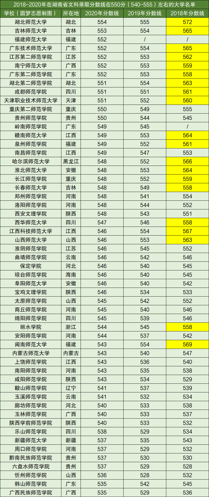 根据2018-2020年湖南普通本科各批次投档线,文科录取分数线在550分左右(540-555分)的大学名单如下: