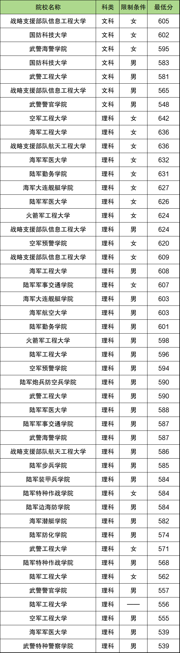 因为在提前批招生院校较多,受到篇幅限制,本文就以军校、警校和定向士官为例,整理出这三类院校在四川提前批的录取分数线。