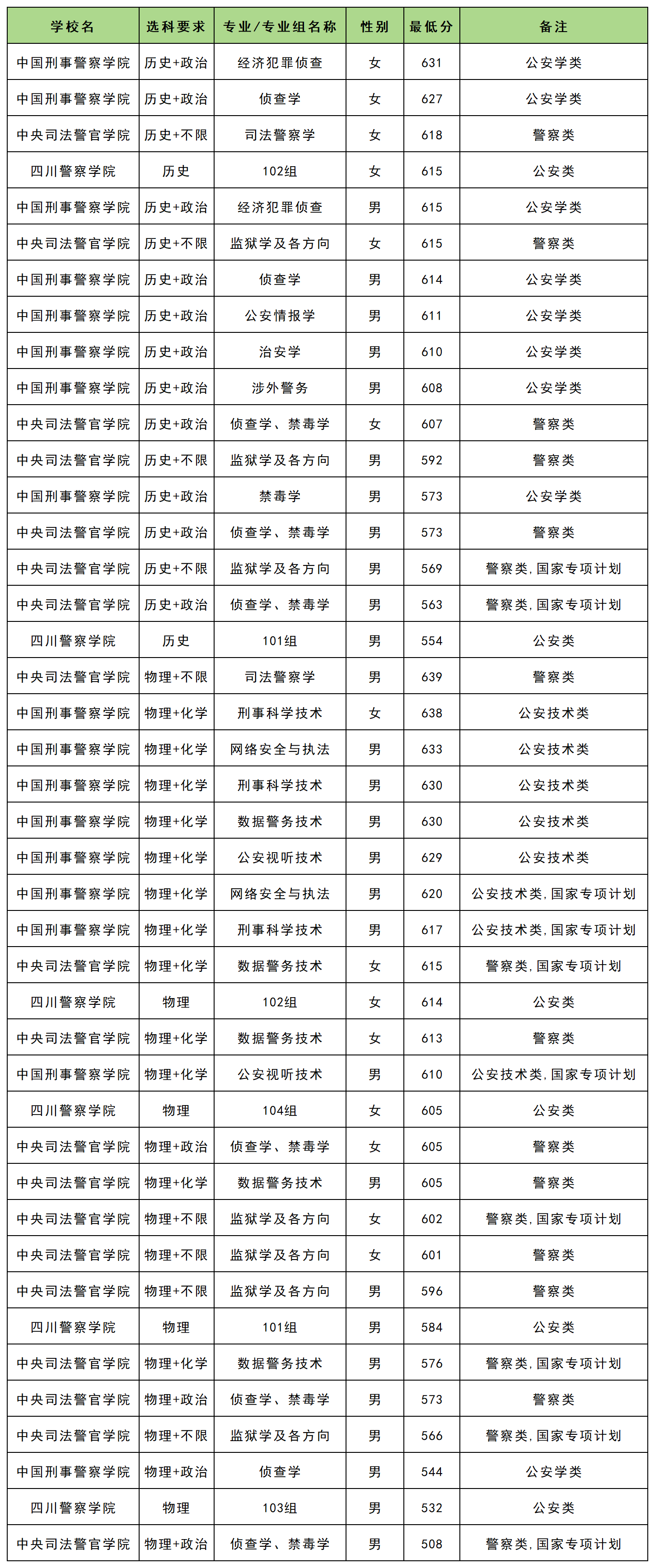 因为在提前批招生院校较多,受到篇幅限制,本文就以警校和定向士官为例,整理出这两类院校在四川提前批的分数线。
