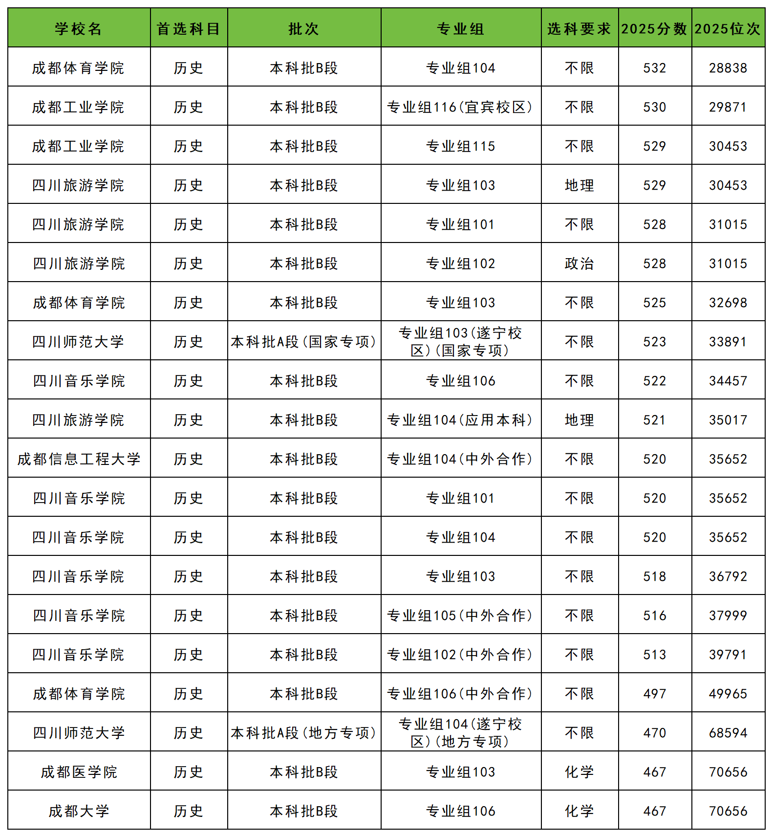 2025年成都历史类公办二本大学录取分数线从467分到532分之间,对应最低排位从70656名到28838名。