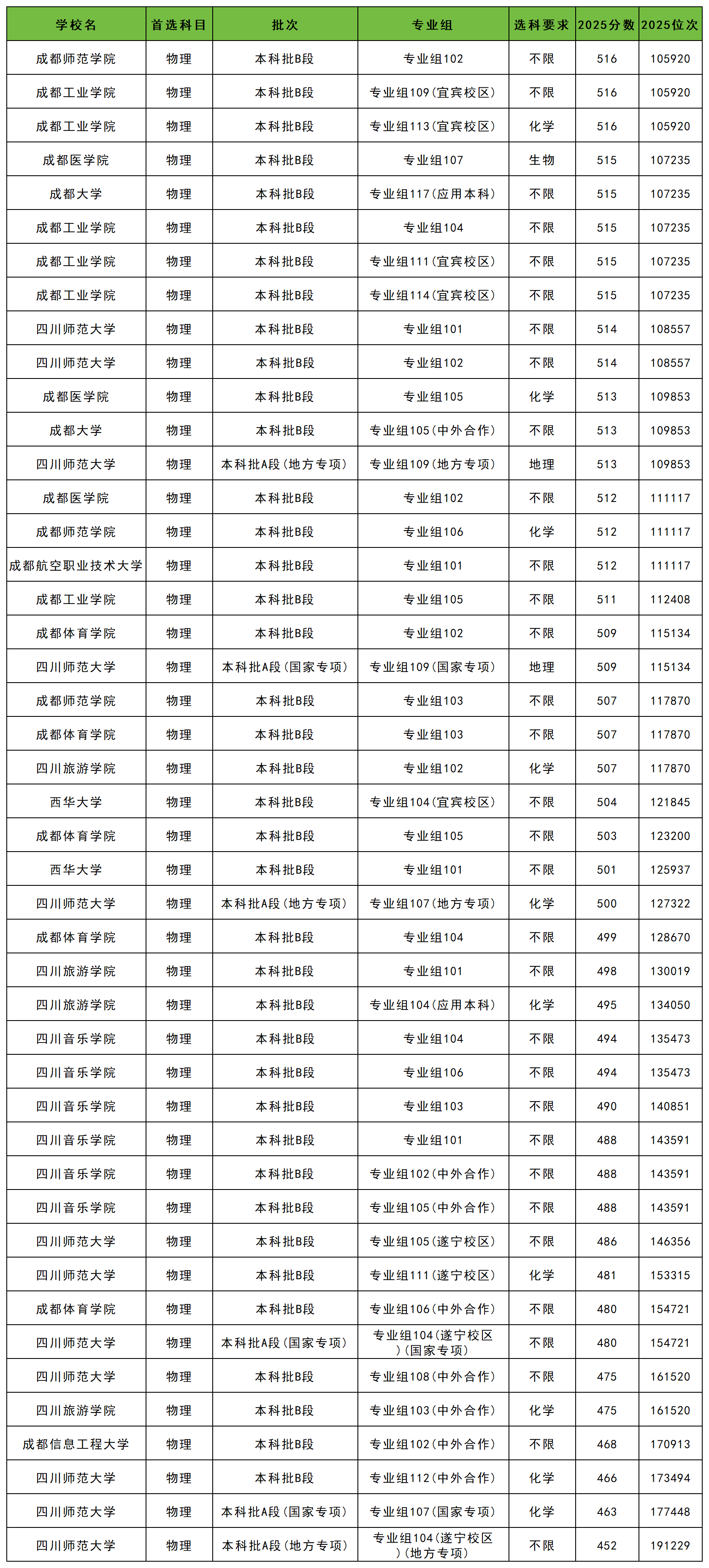 2025年成都物理类公办二本大学录取分数线从452分到516分之间,对应最低排位从191229名到105920名。