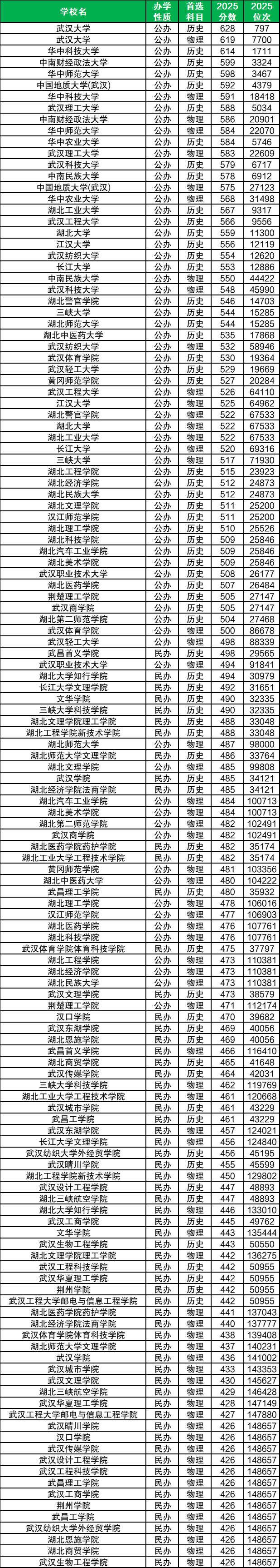 湖北各大学排名为:第1名华中科技大学、第2名武汉大学、第3名武汉理工大学等;参考最新一年高考数据,2025年湖北各大学录取分数线各不相同,如公办院校中,武汉大学历史类628分、物理类619分,华中科技大学历史类614分、物理类591分等。