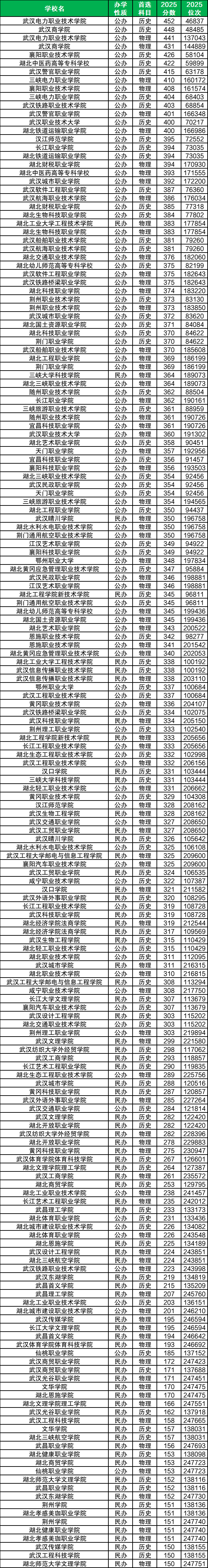 湖北历史组专科各大学录取分数线最低的是:武汉工程科技学院、武汉传媒学院,2025年最低分数线150分,位次排名是138155位。
