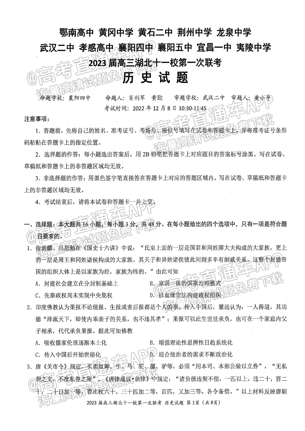一.2023湖北十一校高三12月联考历史试卷详情及答案解析汇总