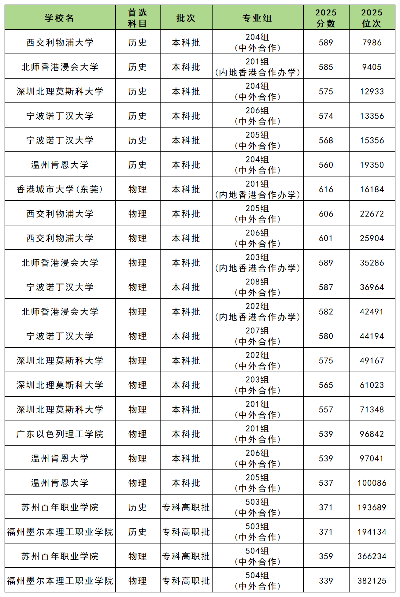 如下为各位展示的是2025年广东中外合作院校的录取分及位次情况: