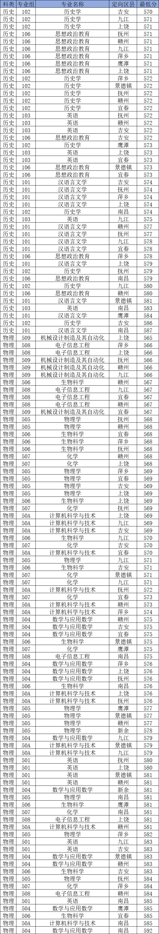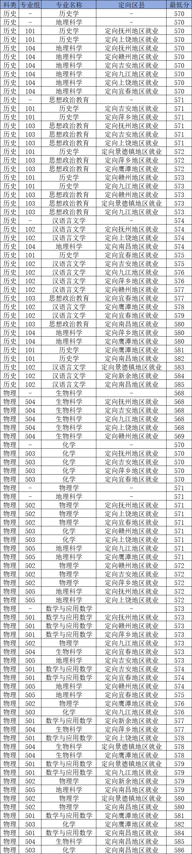 2024年定向师范生最低录取分数线为:历史类570分,专业是历史学,定向地区为吉安;物理类565分,专业是机械设计制造及其自动化,定向地区为上饶。面向不同地区就业最低分一览表: