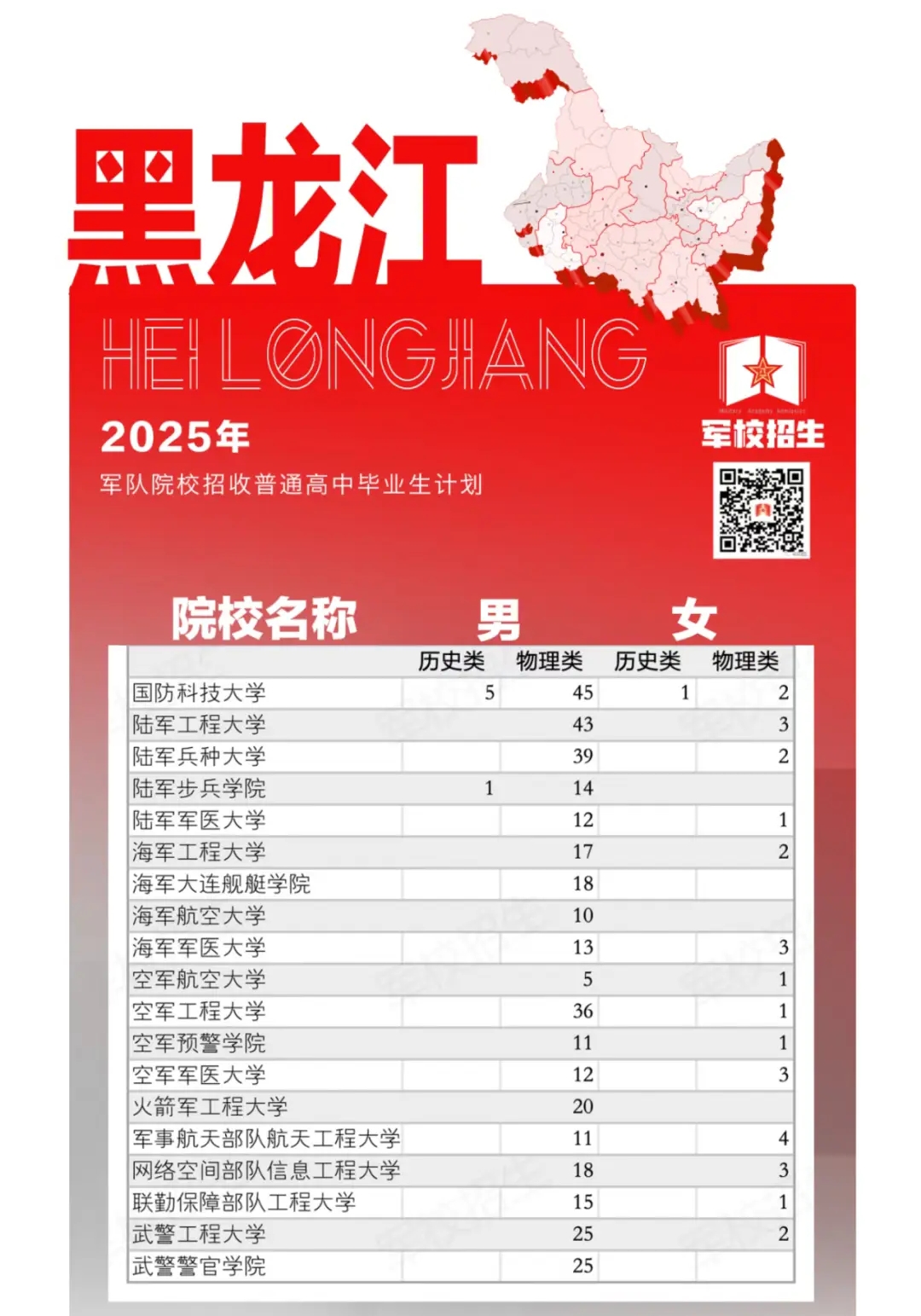 在黑龙江招生的军校有19所,招生计划总数共计425人,其中男生395人,女生30人。国防科技大学计划招生数最多,共有53人,其中男生50人,女生3人。