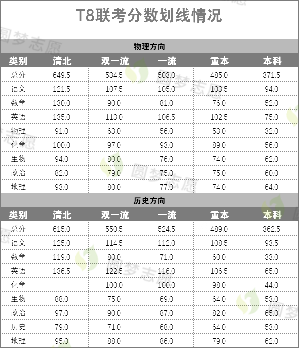 可以看到,依据此次全国T8联考2023届高三第一次联考分数线的划分,物理方向的本科总分为371.5,重本485;历史方向的本科总分线为362.5,重本线为489。