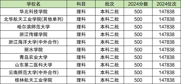 2024年河南理科录取分数为500分的大学有10所,分别为华北科技学院、北华航天工业学院(其他单列)、哈尔滨师范大学、浙江传媒学院等。其中实力排名最强的大学是云南师范大学,其软科2024年全国排名为200名,校友会2024年全国排名为174名。