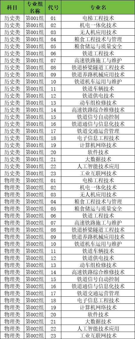 以黑龙江交通职业技术学院为例,各专业代号为:铁道工程技术代号06、铁道车辆技术代号11、铁道供电技术代号12、软件技术代号20、人工智能技术应用代号22等。