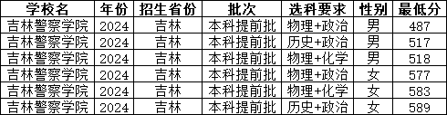 2024年吉林警校院校录取分数线最低分:吉林警察学院487分、中央司法警官学院505分。