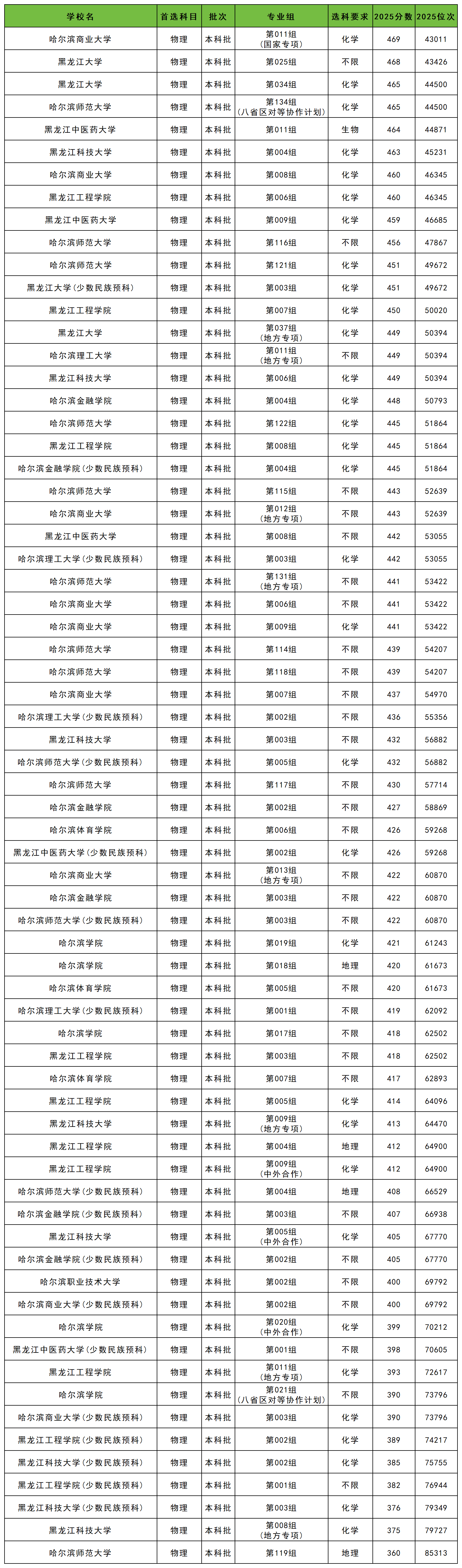 2025年哈尔滨物理类公办二本大学录取分数线从360分到469分之间,对应最低排位从85313名到43011名。