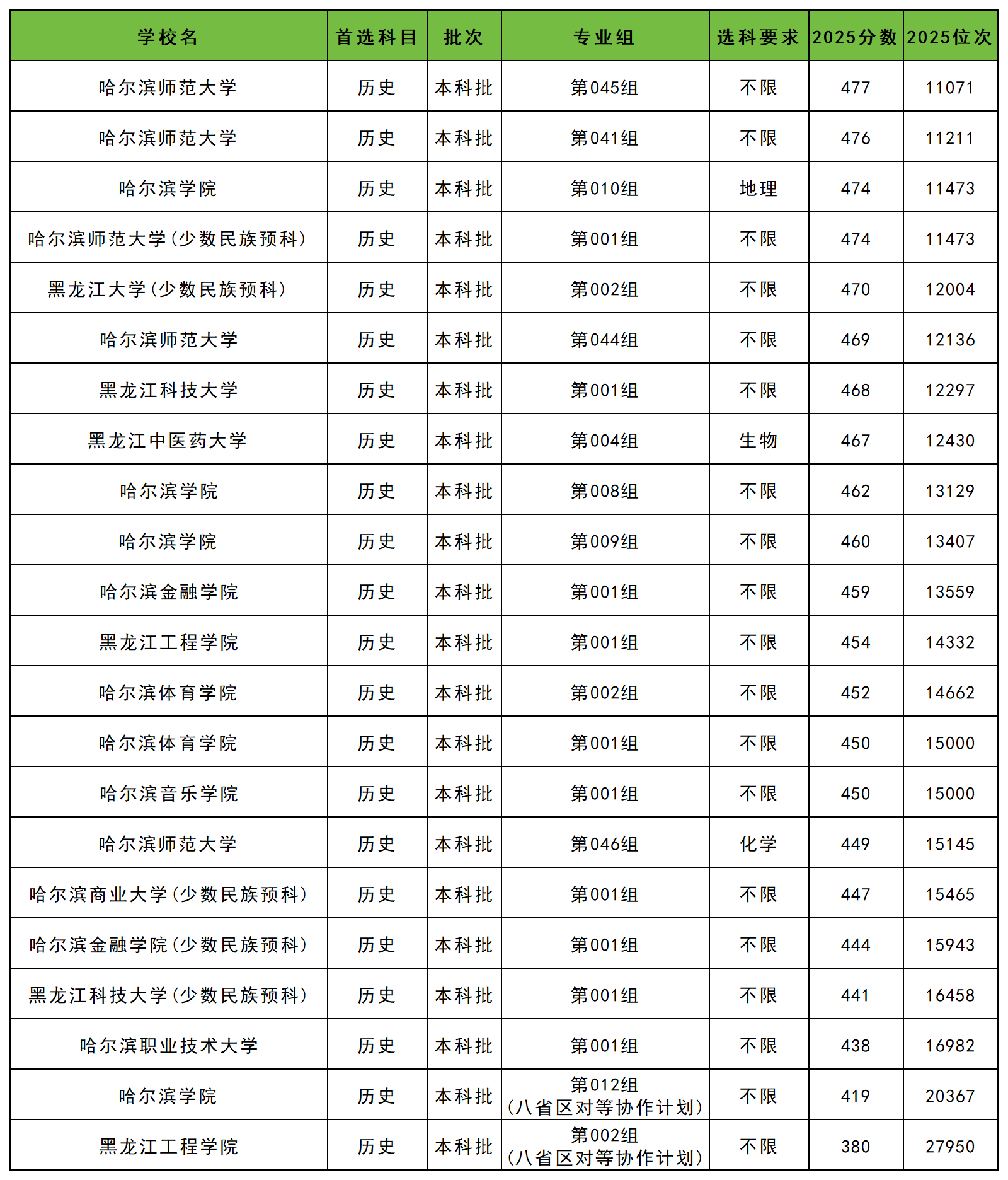 2025年哈尔滨历史类公办二本大学录取分数线从380分到477分之间,对应最低排位从27950名到11071名。