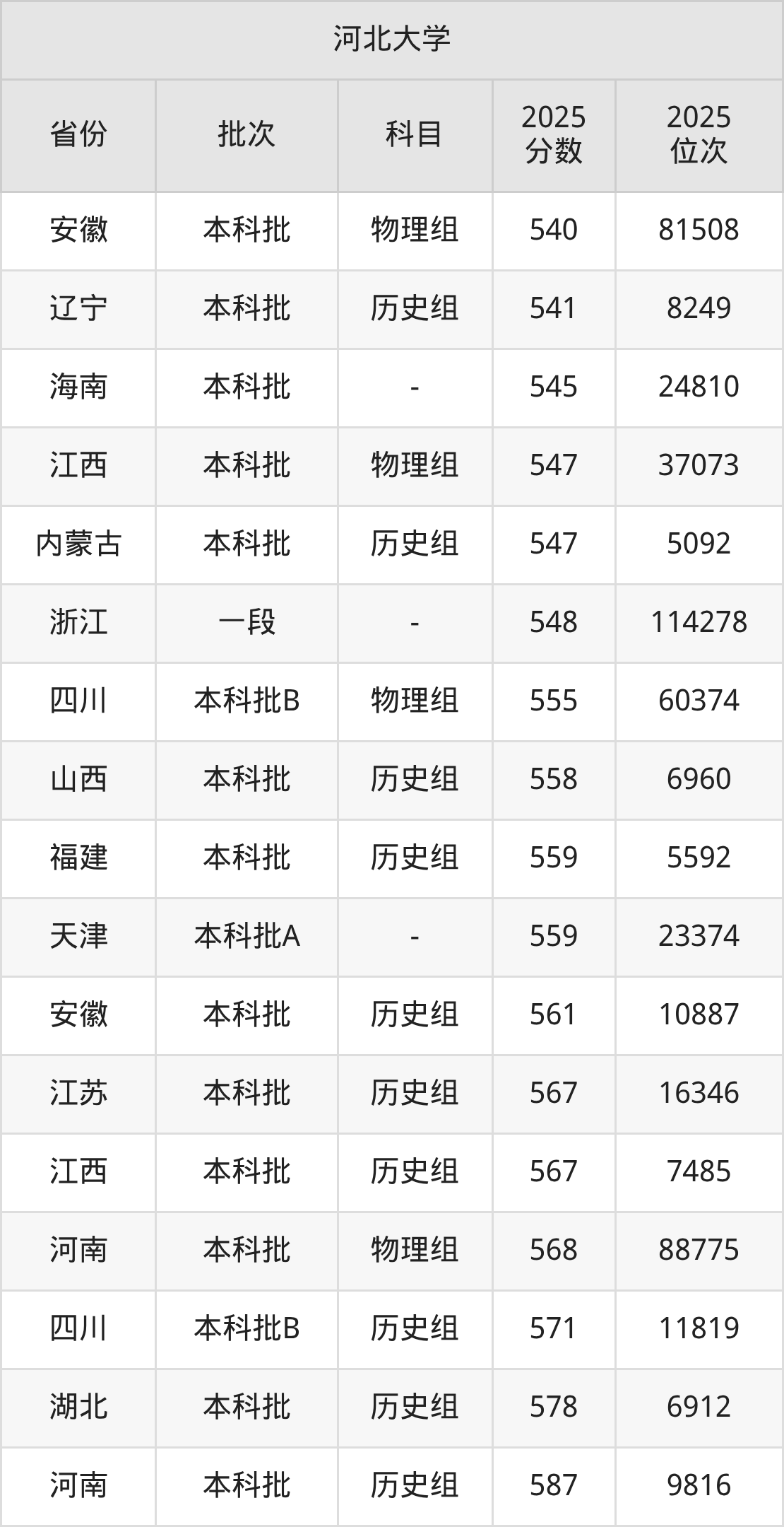 二、河北大学2025年录取分数线汇总
