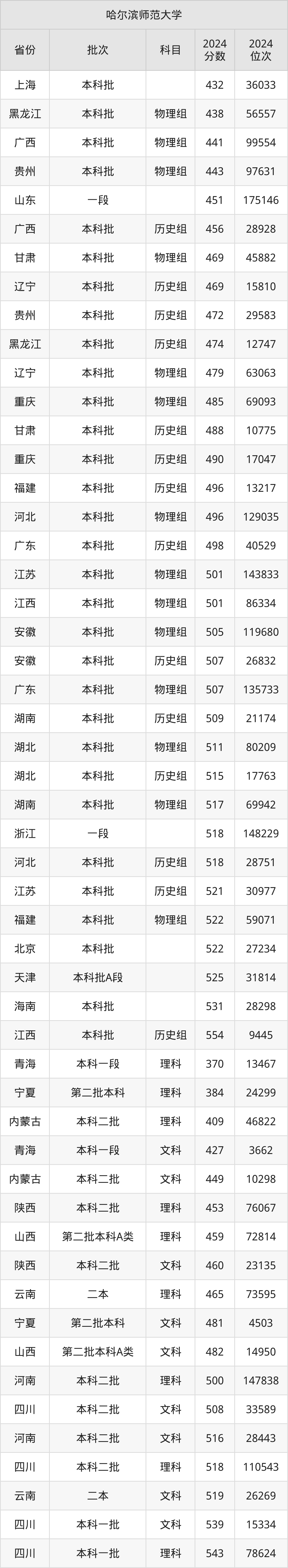 在上海本科批,哈尔滨师范大学的最低分是432、最低录取位次是36033名。在黑龙江本科批物理组,哈尔滨师范大学的最低分是438、最低录取位次是56557名。