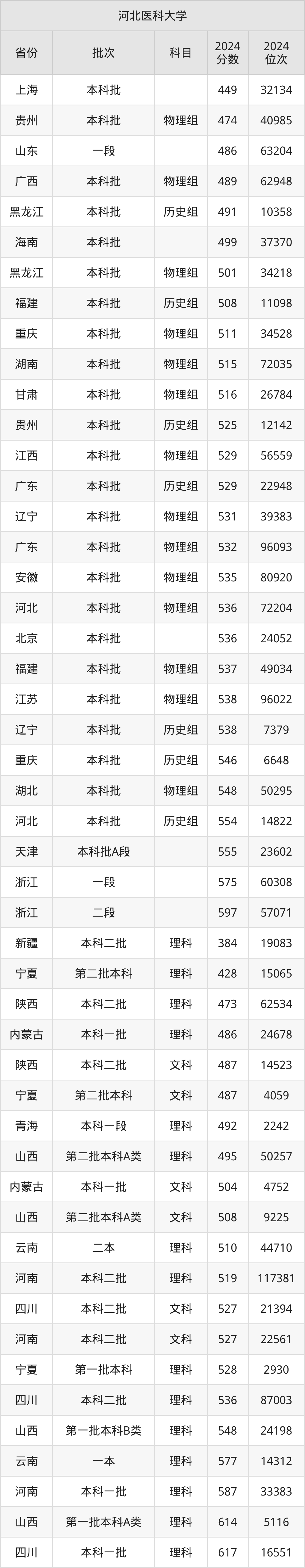 在上海本科批,河北医科大学的最低分是449、最低录取位次是32134名。在贵州本科批物理组,河北医科大学的最低分是474、最低录取位次是40985名。