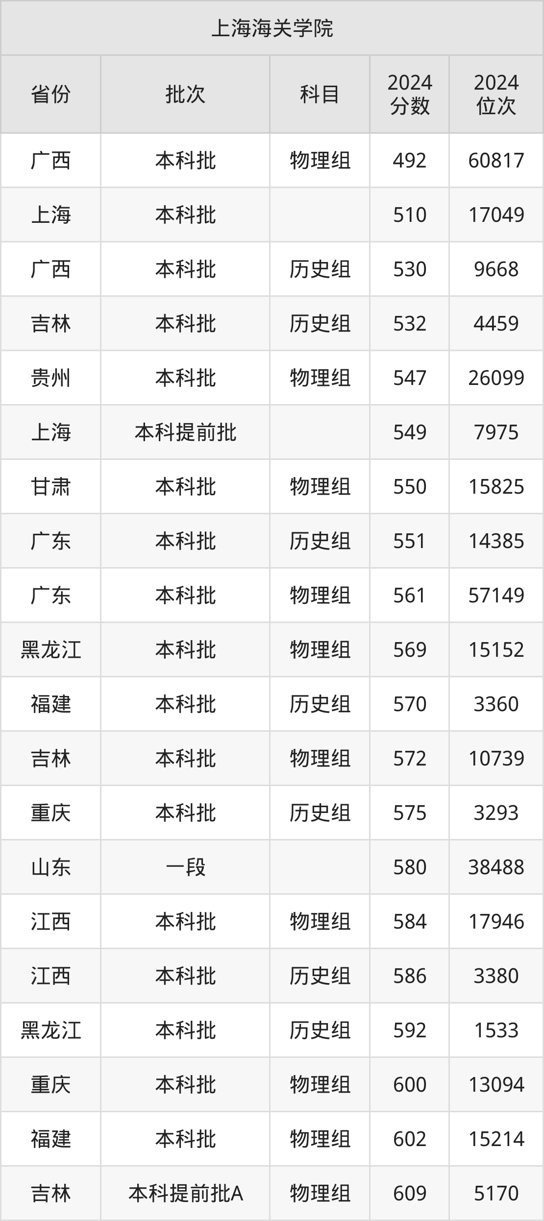 在广西本科批物理组,上海海关学院的最低分是492、最低录取位次是60817名。在上海本科批,上海海关学院的最低分是510、最低录取位次是17049名。